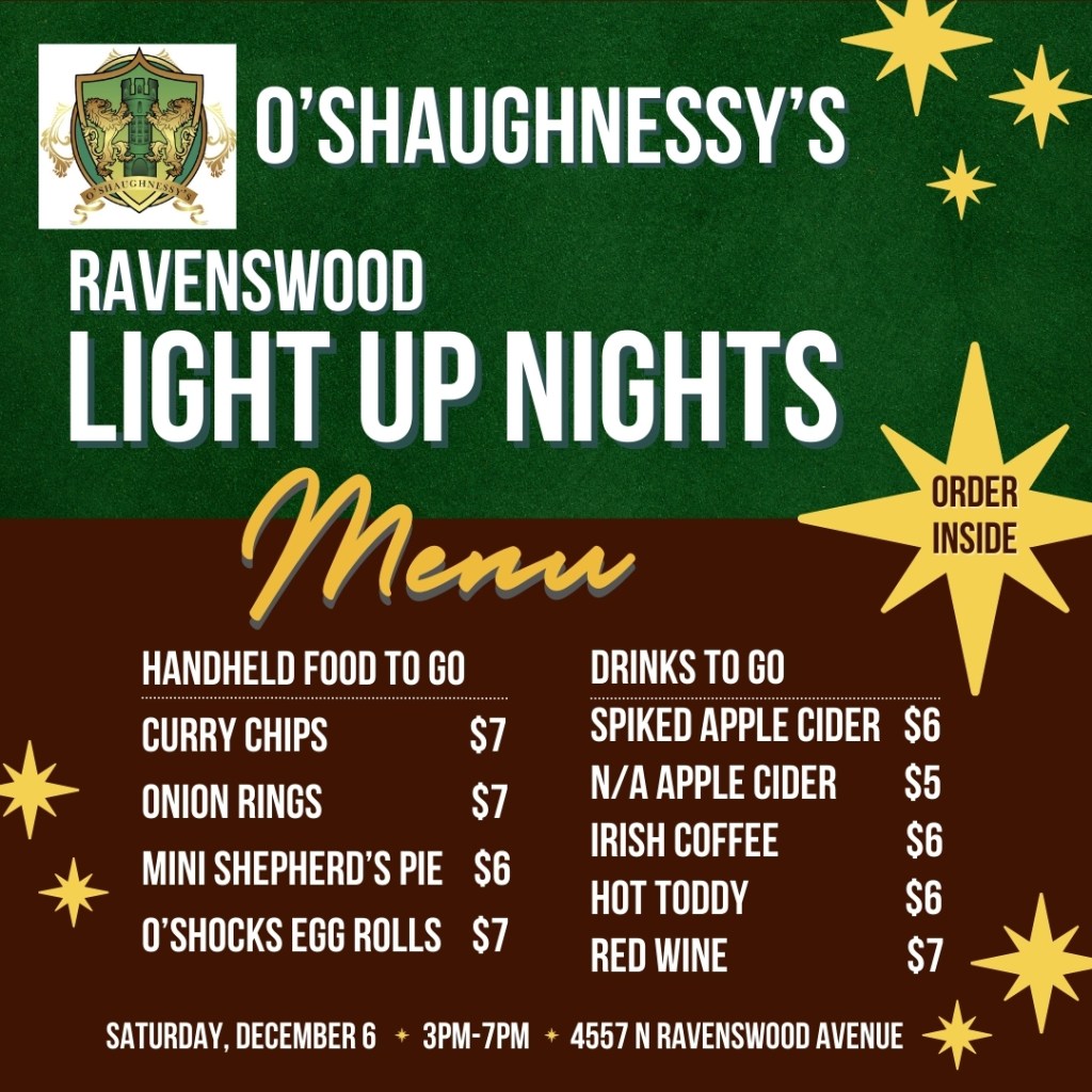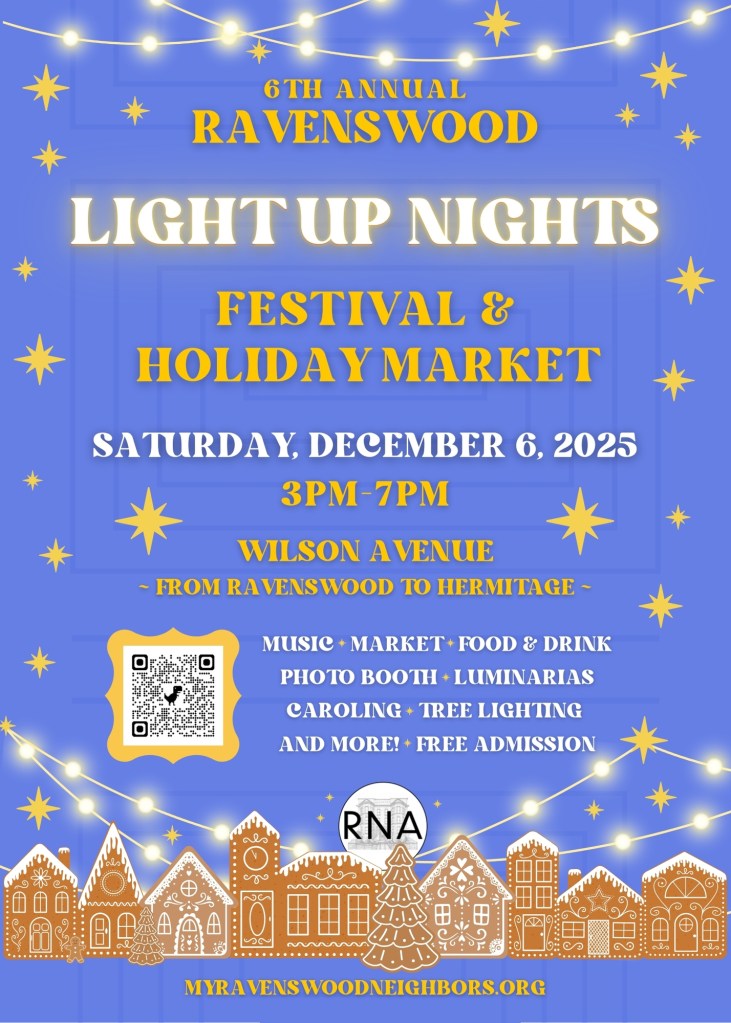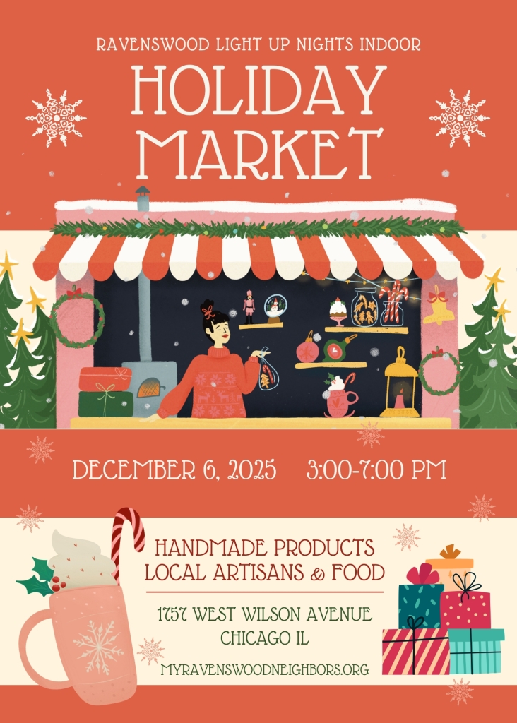 Join us on Saturday, December 6th, from 3pm-7pm for our 6th annual Ravenswood Light Up Nights Festival + Holiday Market! We are bringing the festivities to Wilson Avenue (between Ravenswood & Hermitage) for one night only! This free event will include live music, an indoor holiday market, food and drink vendors, restaurant specials, a kids’ scavenger hunt, photo stations, a tree lighting ceremony, free hot cocoa (while supplies last), caroling, visits with Santa, ice sculpting, and more. We hope you can join us for this kickoff to the holiday season!