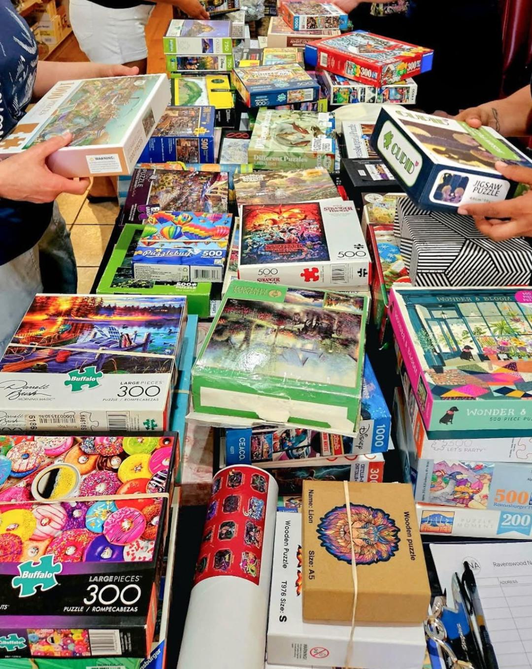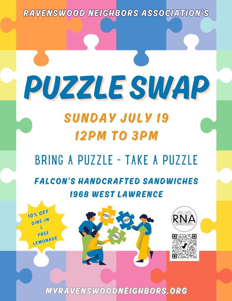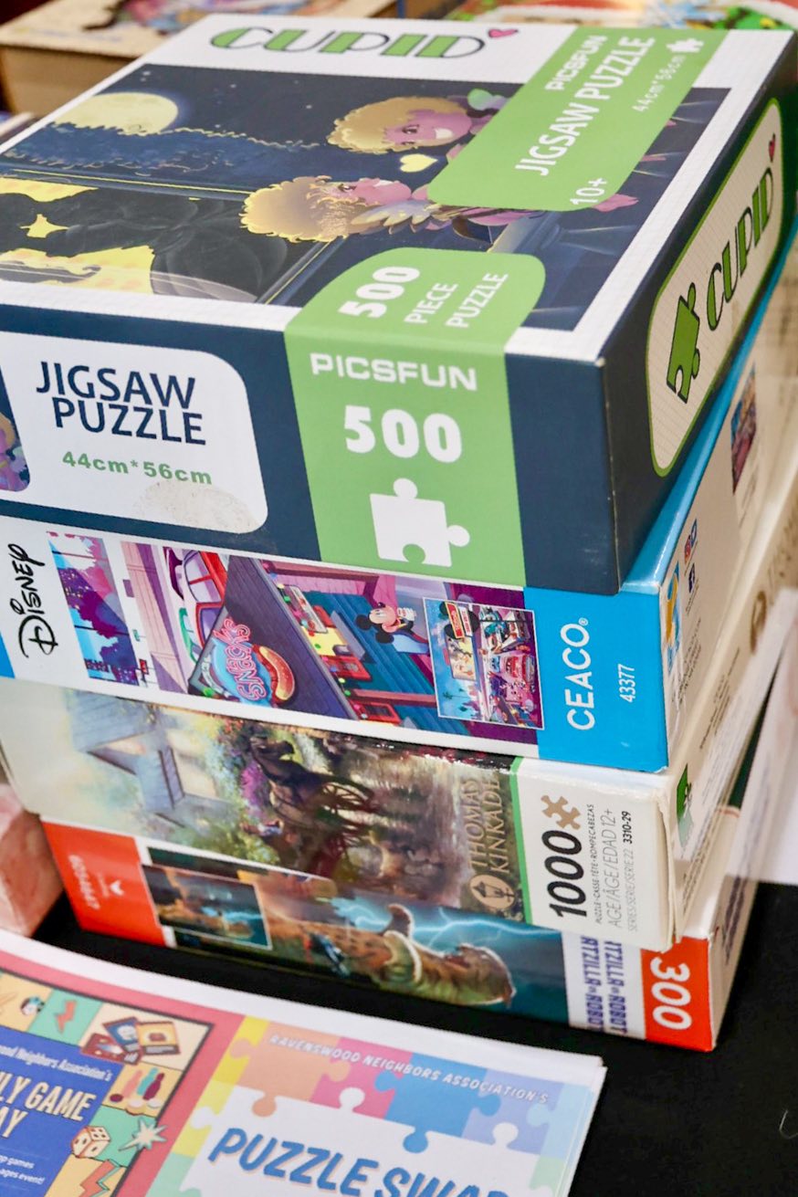 The Ravenswood Neighbors Association hosts several puzzle swaps throughout the year. Locations vary within Ravenswood. Please check below for swap dates, join our mailing list, or visit our social media for the latest event updates.